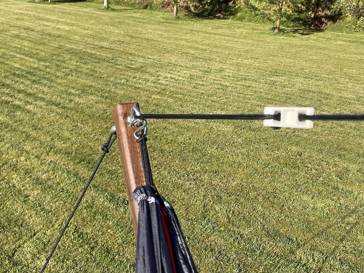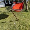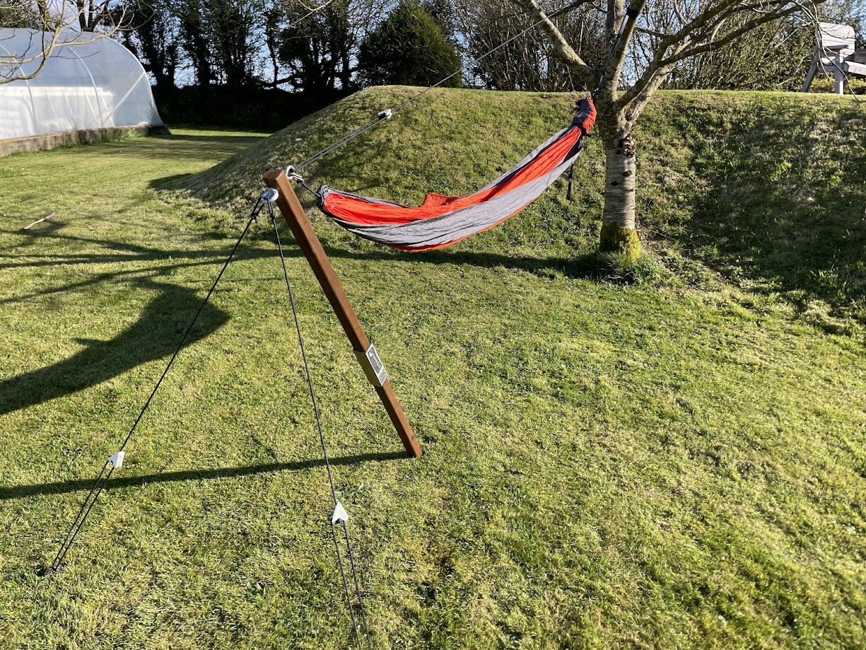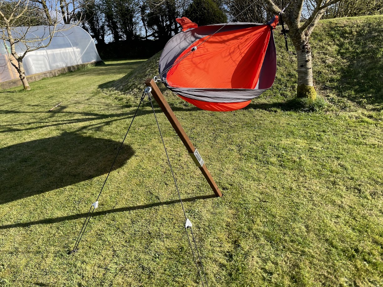 Two trees spaced 3 or 4m apart in your garden is a wonderful thing for an aspiring hammockist. Building regs don’t specify that as a condition for house building which means often people often just have one tree where they want to hang. And so here is your solution my friends. Half a Hammock stand is the other end. By creating a tripod from a sturdy stick, two guy ropes and a pair of bad boy ground anchors you have made something very stable.