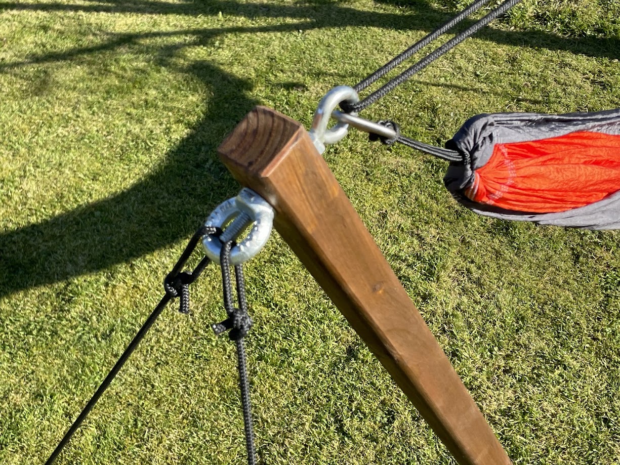 The stand has a 5m long rope going from the stand back to the tree, this is to make getting in and out easier and to keep everything in place when nobody is in the hammock. It takes no real strain so can be tied with any old granny knot to the highest point you can reach, this keeps the rope out of your way. With this rope attached you can remove the hammock without everything collapsing. Cork genius.