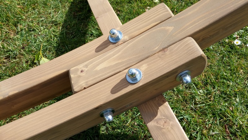 We have these stands made specially for us by a really nice company in Poland. When specifying the design we wanted to make assembly as quick and foolproof as possible, so, for example, there are only 8 bolts and they are all the same length, any bolt will fit into any hole. The wooden pieces are symmetrical so there’s no getting the arms or braces the wrong way round. Adjusting the chains for raising or lowering the hammock is simple. Tools needed come in the box.
